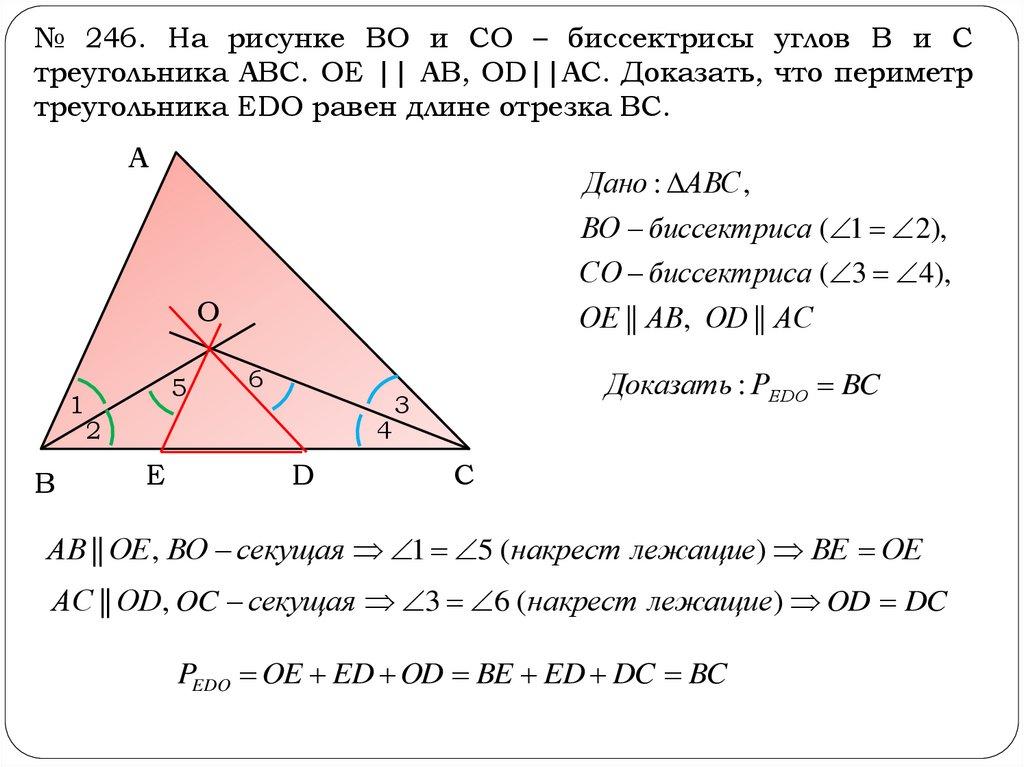№ 246. На рисунке ВО и СО – биссектрисы углов В и Стреугольника АВС. OE || AB, OD||AC. Доказать, что периметр