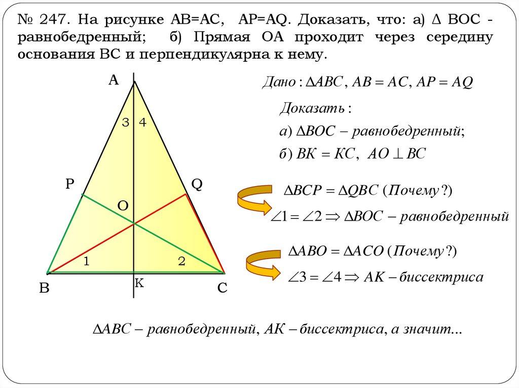 № 247. На рисунке АВ=АС, AP=AQ. Доказать, что: а) Δ ВОС равнобедренный;б) Прямая ОА проходит через середину