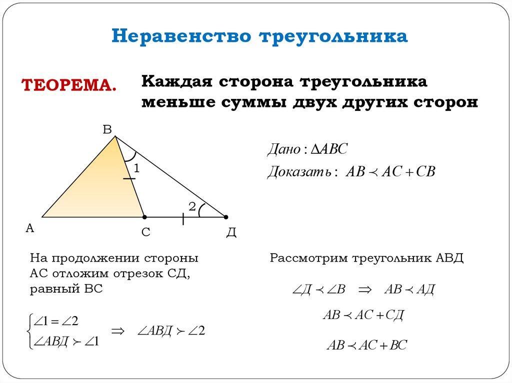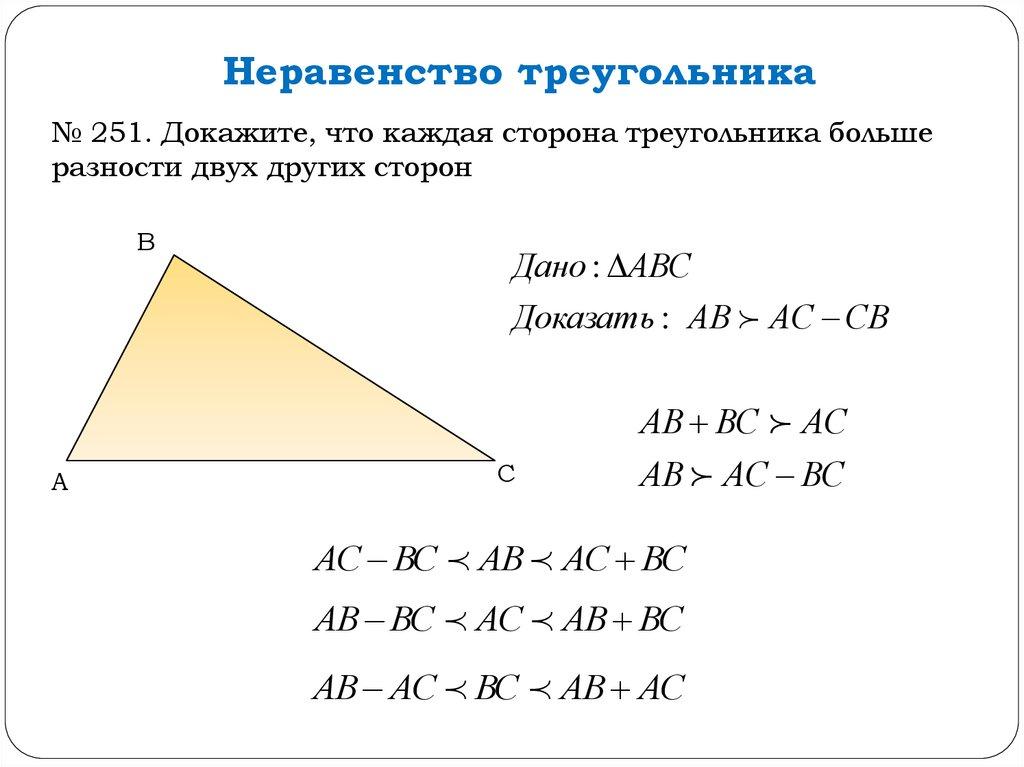 Неравенство треугольника№ 251. Докажите, что каждая сторона треугольника больше