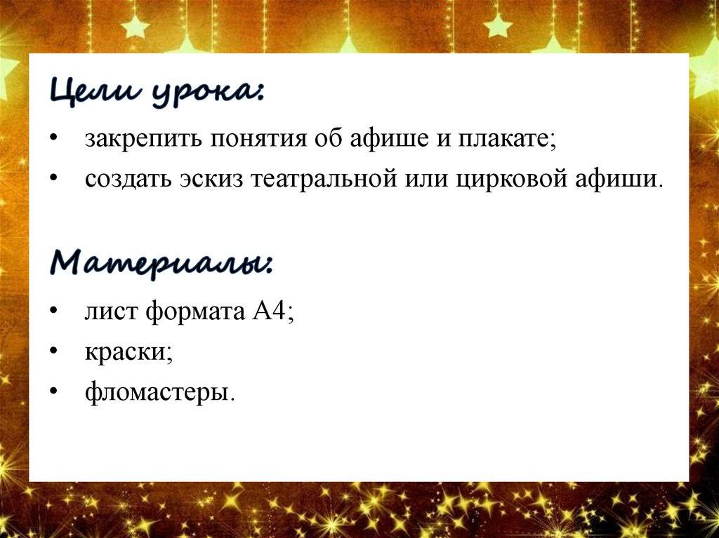 • закрепить понятия об афише и плакате;• создать эскиз театральной или цирковой афиши.