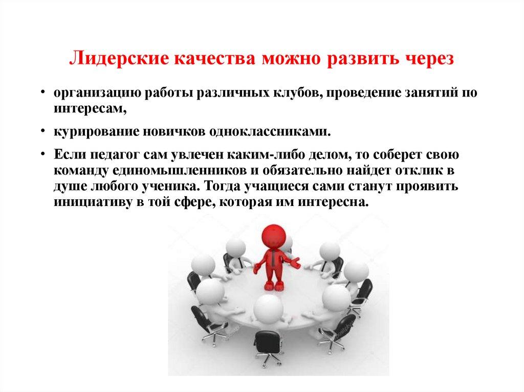 Лидерские качества можно развить через• организацию работы различных клубов, проведение занятий по