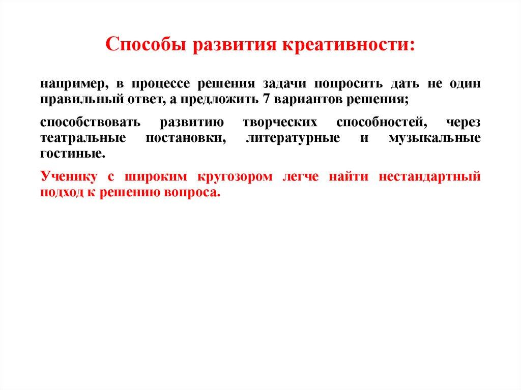 Способы развития креативности:например, в процессе решения задачи попросить дать не один