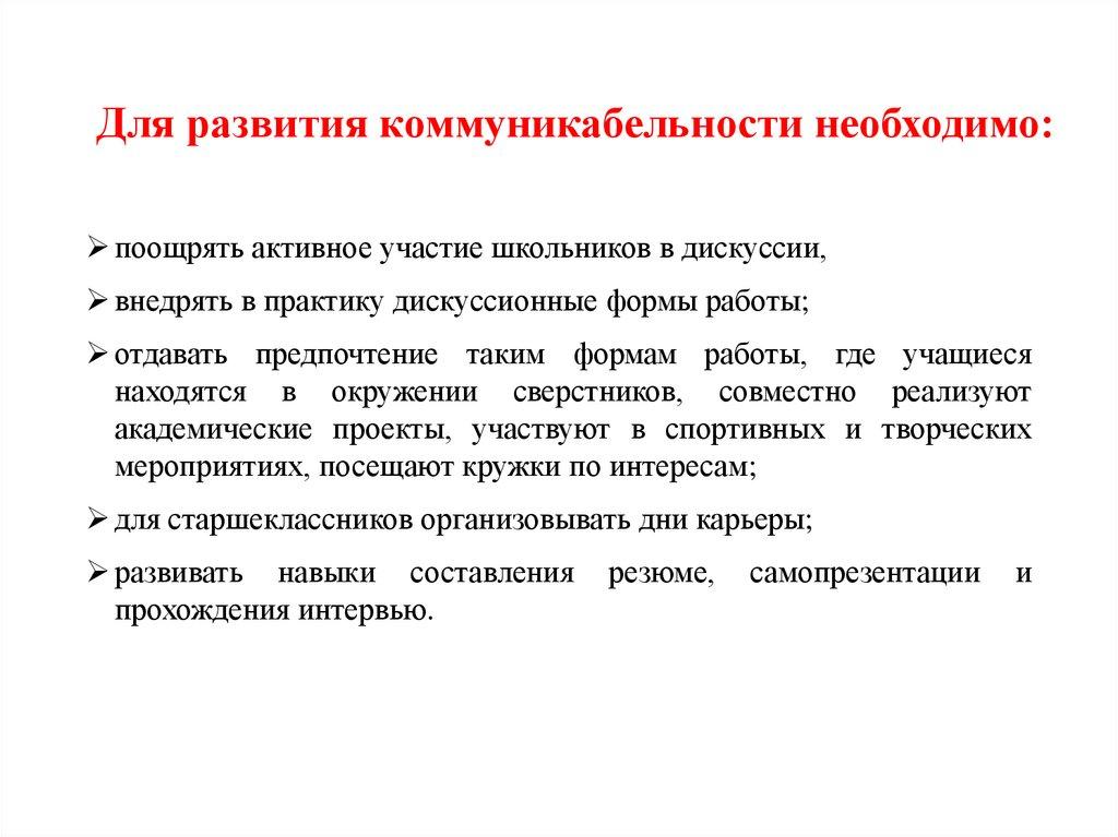 Для развития коммуникабельности необходимо:поощрять активное участие школьников в дискуссии,