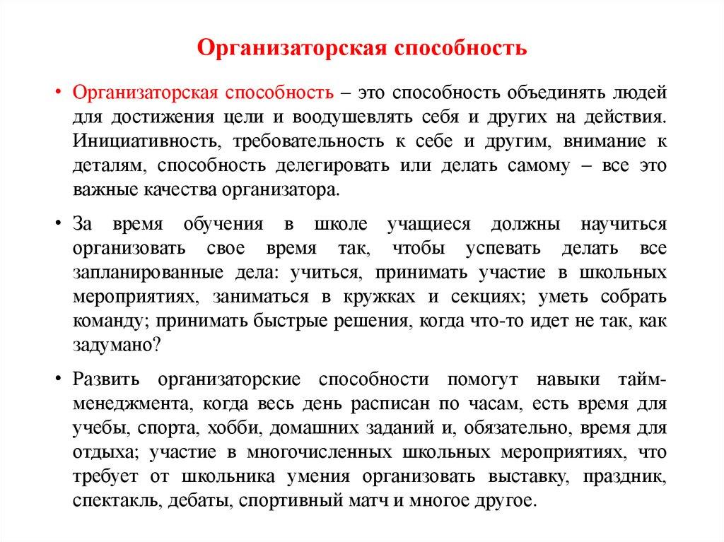 • Развить организаторские способности помогут навыки таймменеджмента, когда весь день расписан по часам, есть время для