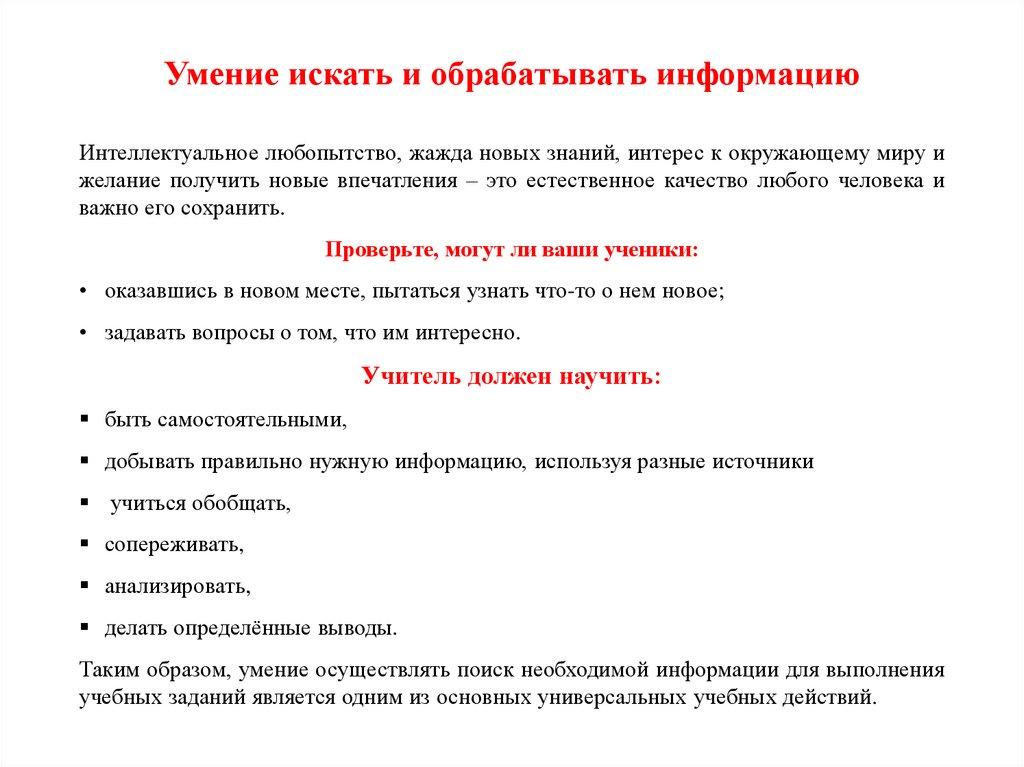 Умение искать и обрабатывать информациюИнтеллектуальное любопытство, жажда новых знаний, интерес к окружающему миру и