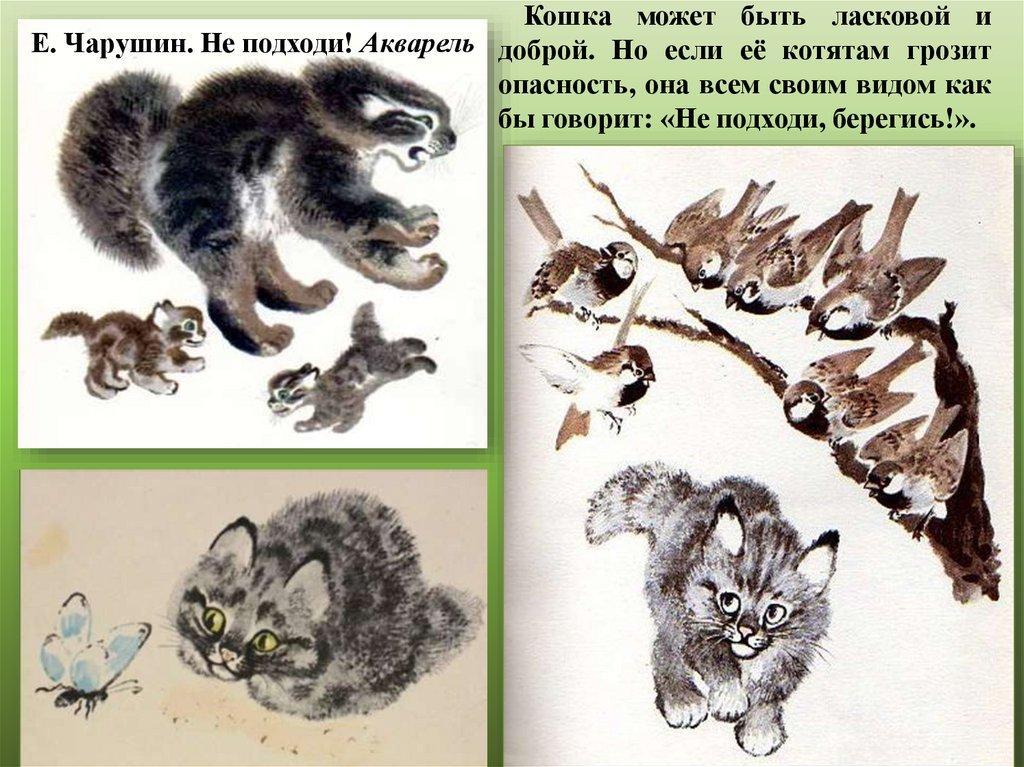 Кошка может быть ласковой иЕ. Чарушин. Не подходи! Акварель доброй. Но если её котятам грозит