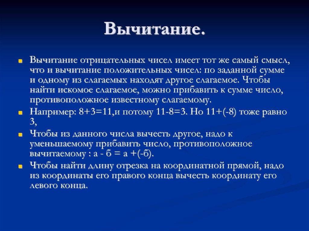 Вычитание отрицательных чисел имеет тот же самый смысл,