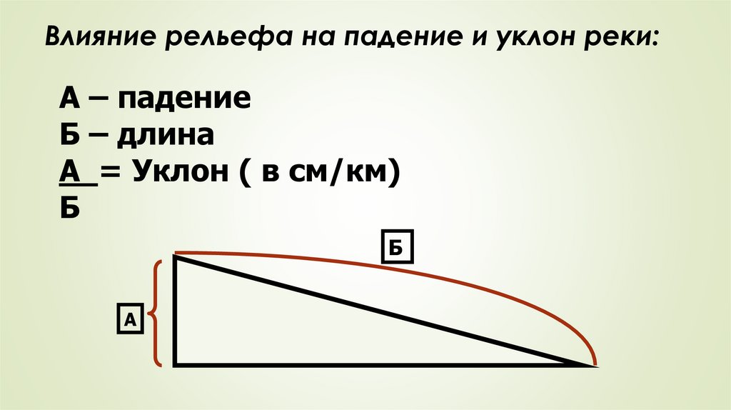 Влияние рельефа на падение и уклон реки:А – падение