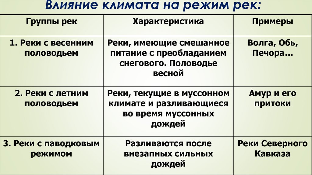 Влияние климата на режим рек:Группы рек