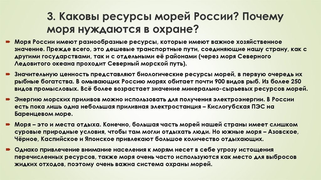 3. Каковы ресурсы морей России? Почемуморя нуждаются в охране?
