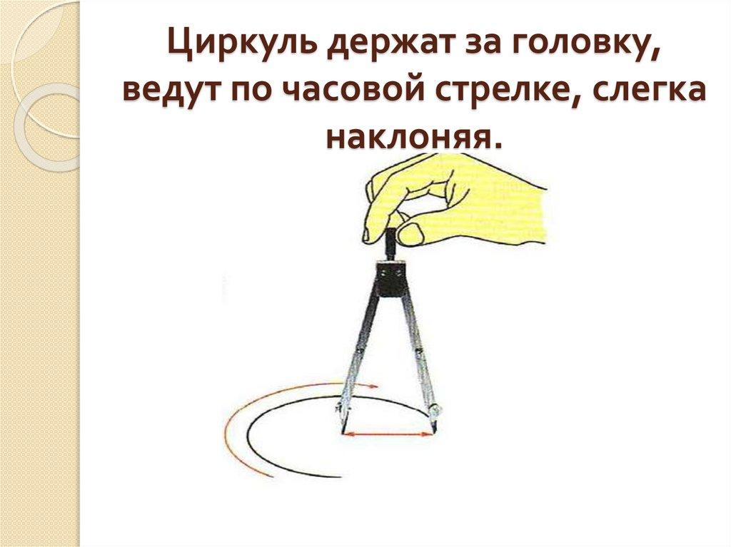 Циркуль держат за головку,ведут по часовой стрелке, слегка