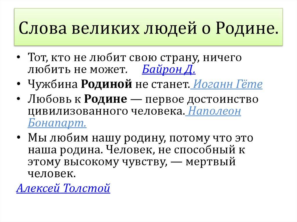 Слова великих людей о Родине.• Тот, кто не любит свою страну, ничего