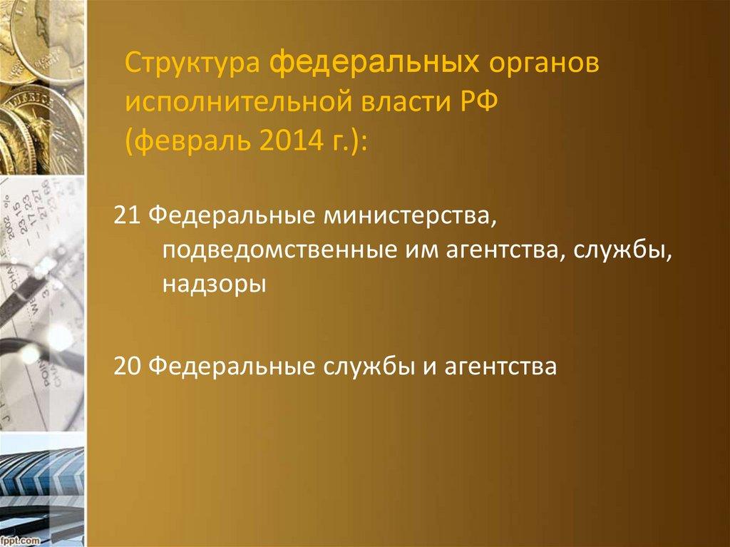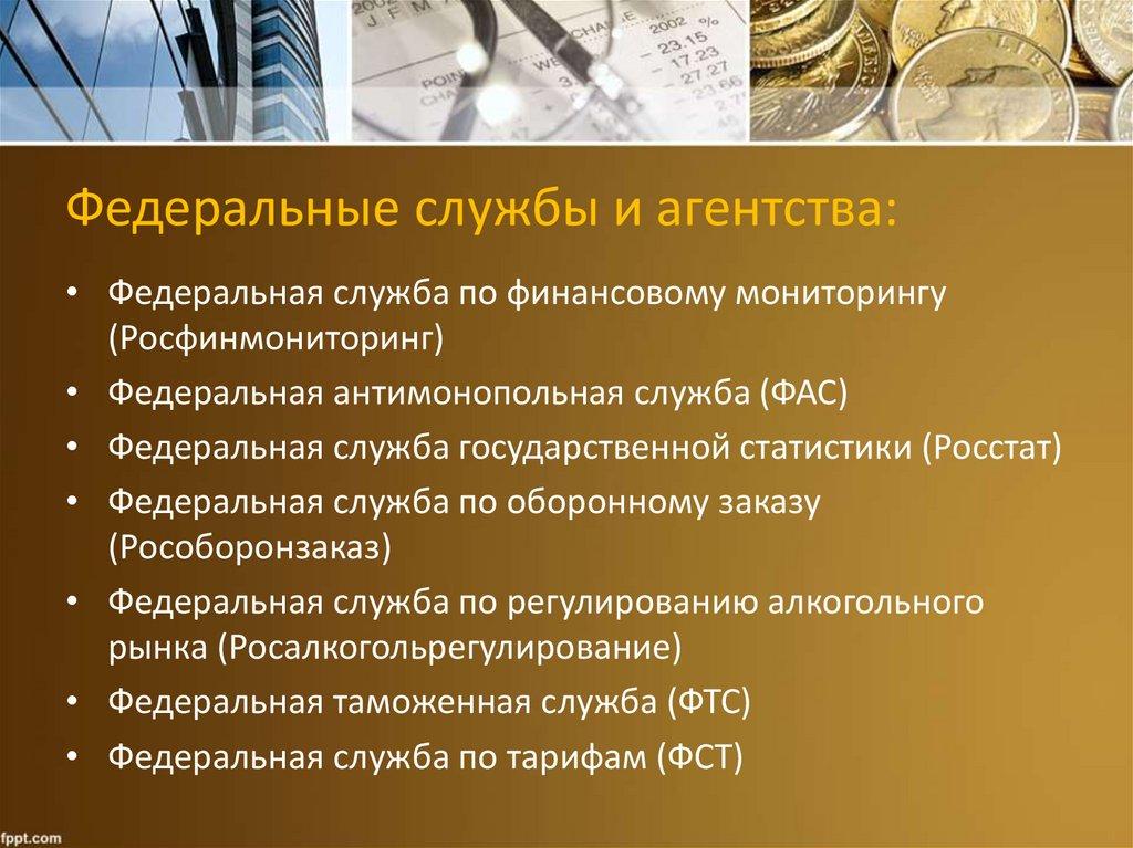 Федеральные службы и агентства:• Федеральная служба по финансовому мониторингу