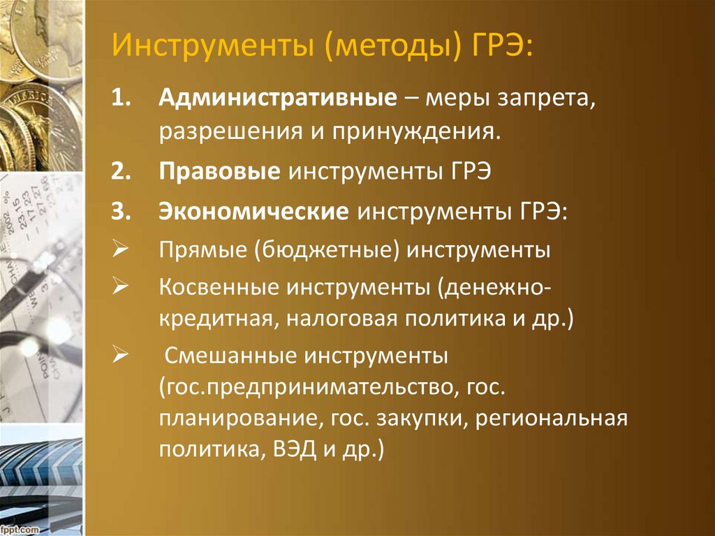 Инструменты (методы) ГРЭ:1. Административные – меры запрета,