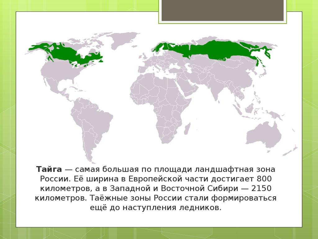 Тайга — самая большая по площади ландшафтная зонаРоссии. Её ширина в Европейской части достигает 800