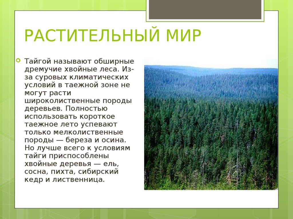 РАСТИТЕЛЬНЫЙ МИРТайгой называют обширные