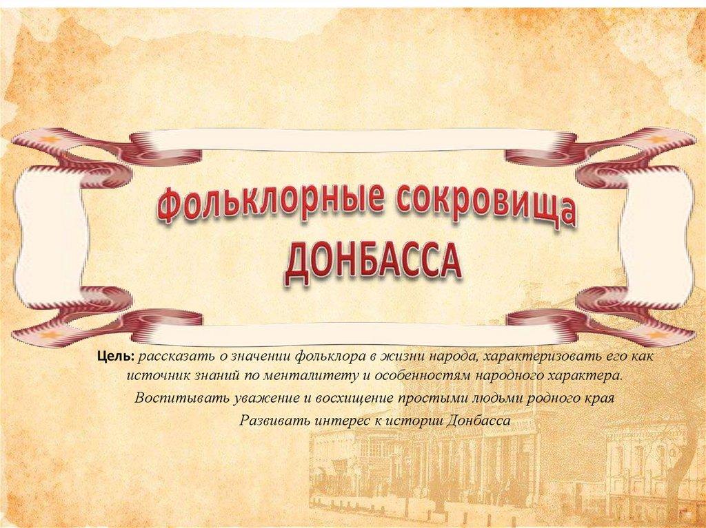 Цель: рассказать о значении фольклора в жизни народа, характеризовать его какисточник знаний по менталитету и особенностям народного характера.