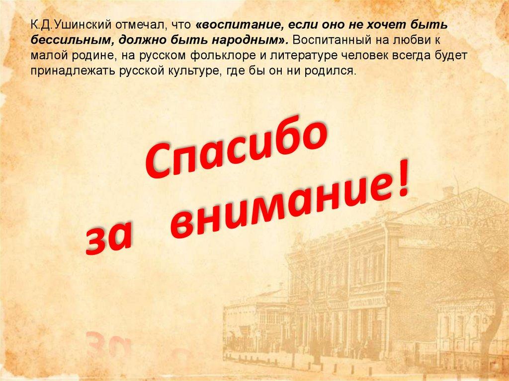 К.Д.Ушинский отмечал, что «воспитание, если оно не хочет бытьбессильным, должно быть народным». Воспитанный на любви к