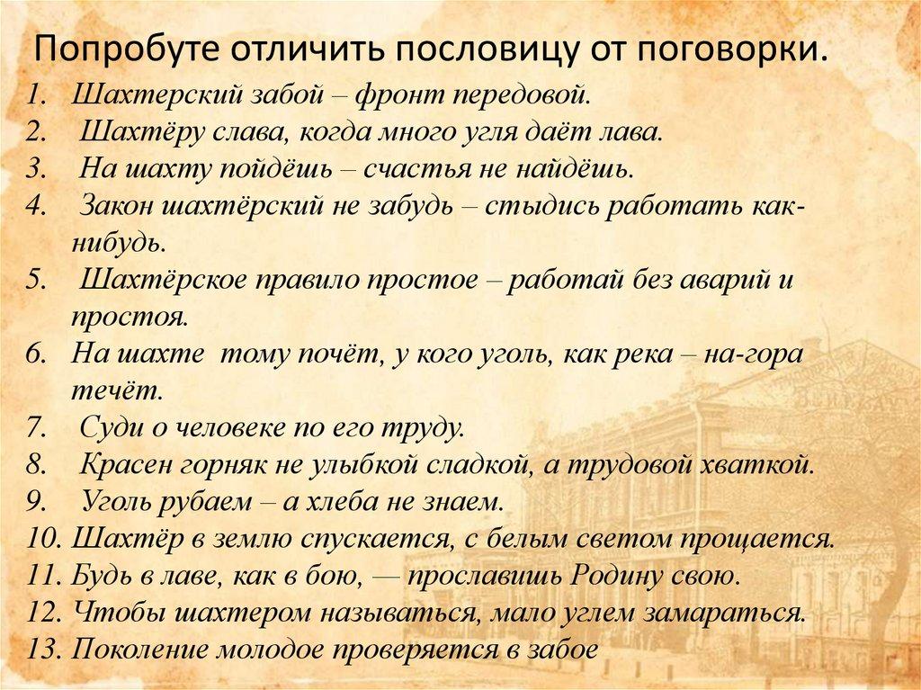 Попробуте отличить пословицу от поговорки.Шахтерский забой – фронт передовой.