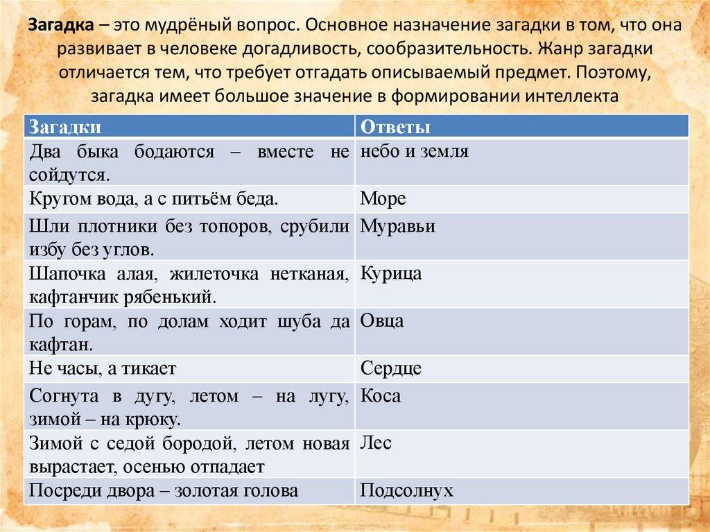Загадка – это мудрёный вопрос. Основное назначение загадки в том, что онаразвивает в человеке догадливость, сообразительность. Жанр загадки