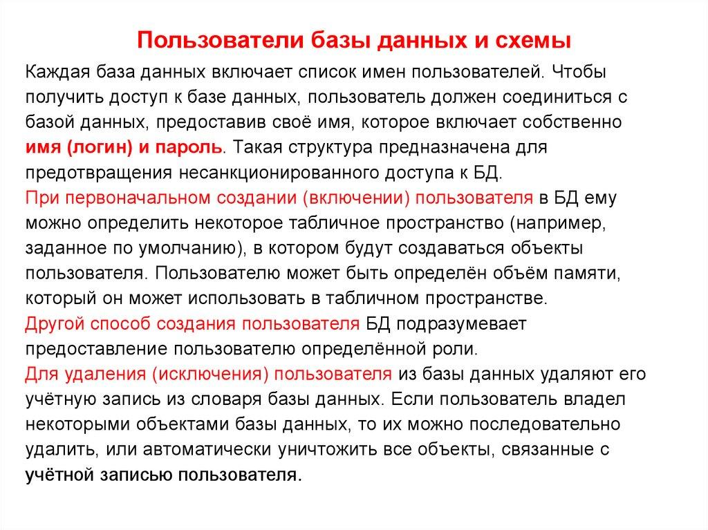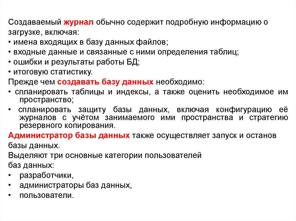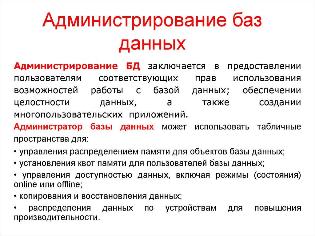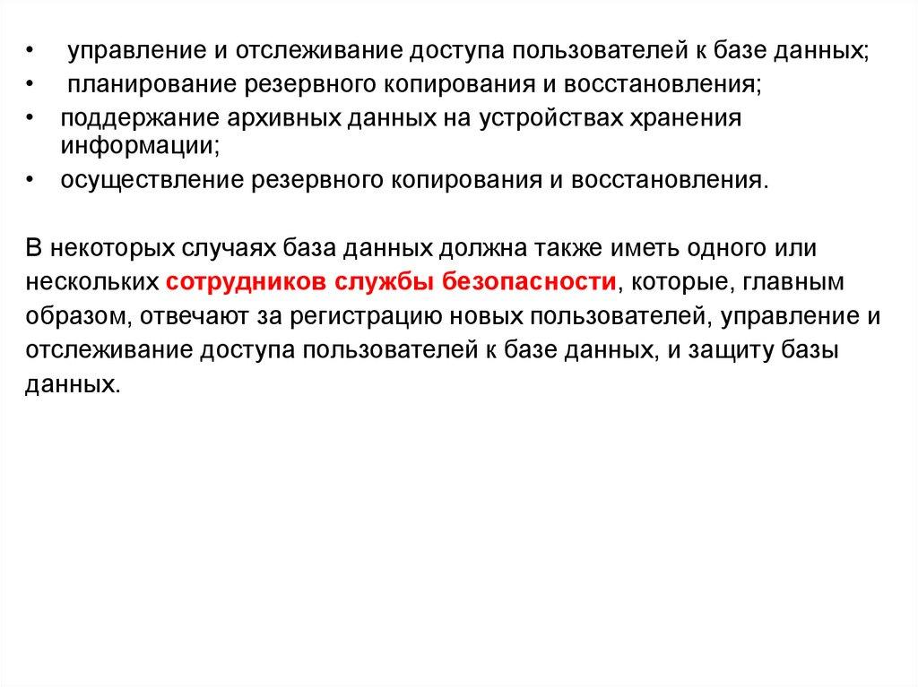 • управление и отслеживание доступа пользователей к базе данных;• планирование резервного копирования и восстановления;