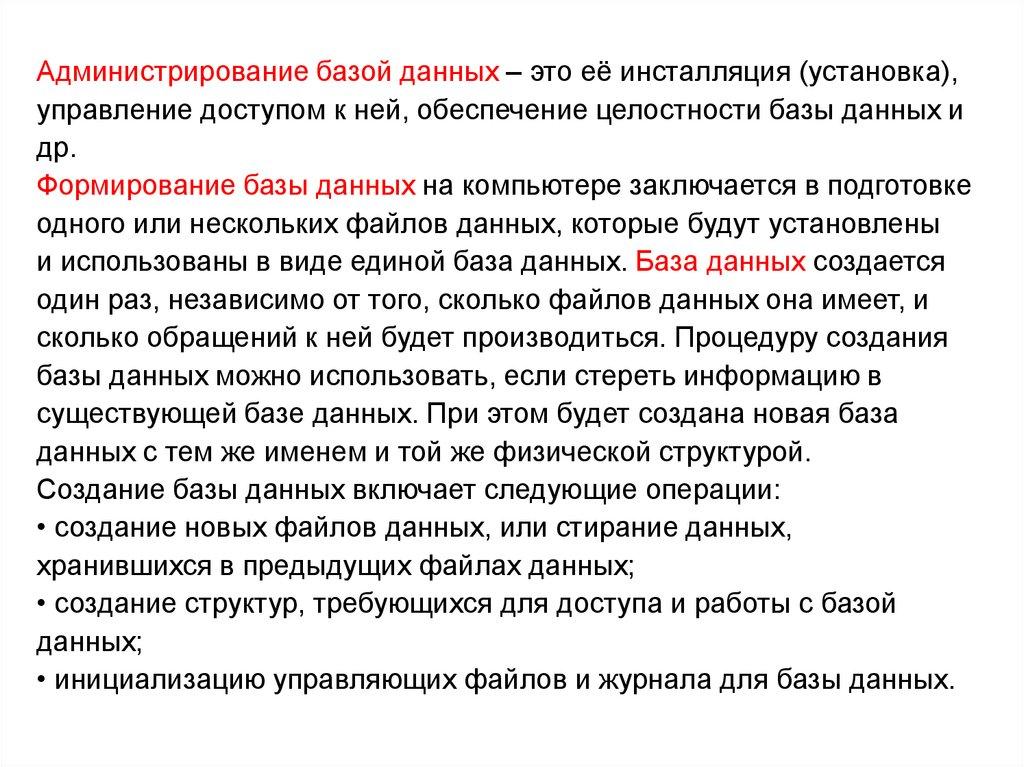 Администрирование базой данных – это её инсталляция (установка),управление доступом к ней, обеспечение целостности базы данных и