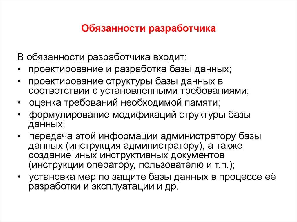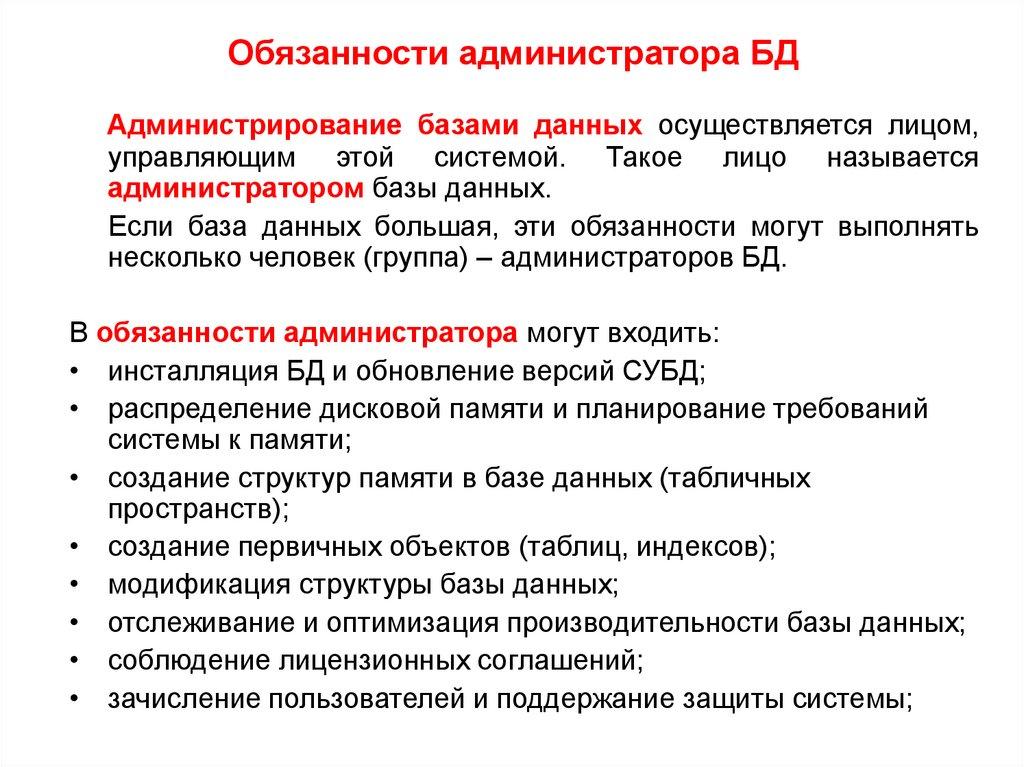 Обязанности администратора БДАдминистрирование базами данных осуществляется лицом,