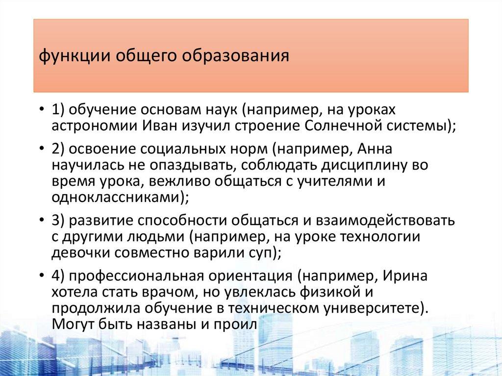 функции общего образования• 1) обучение основам наук (например, на уроках