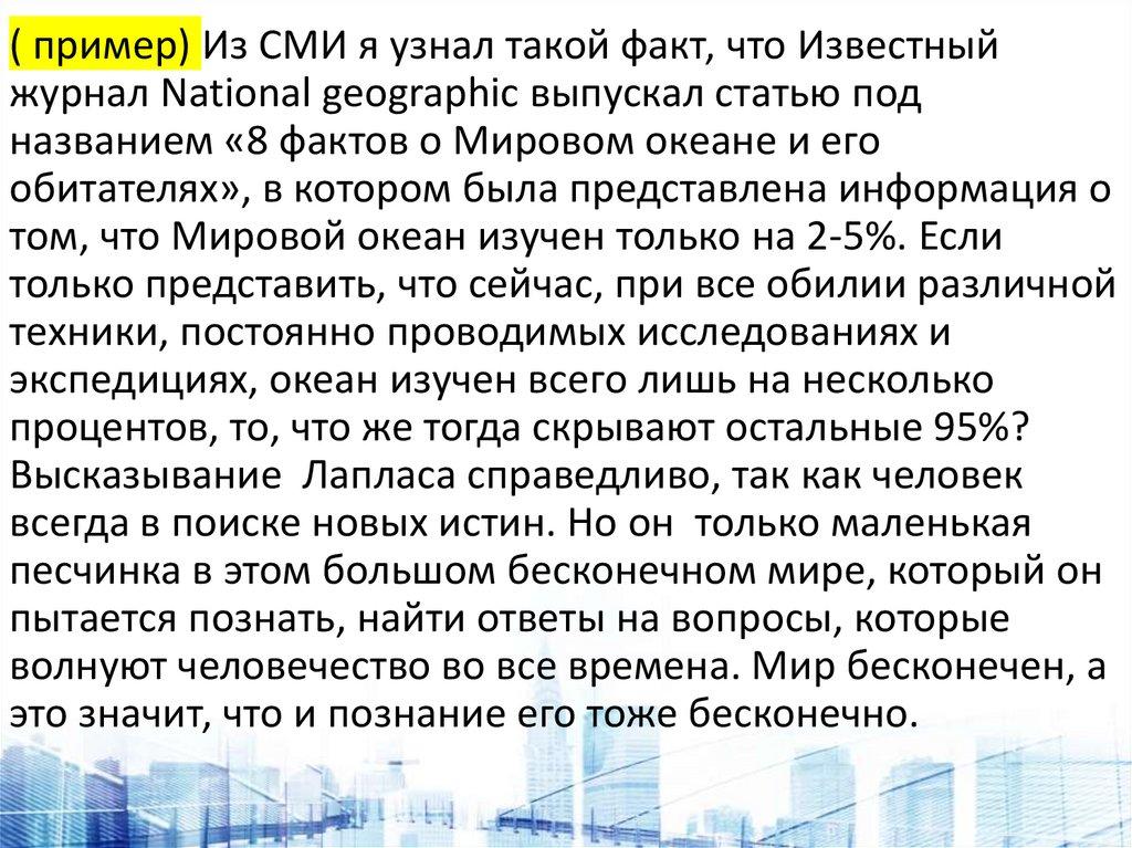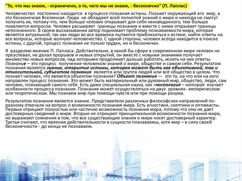 "То, что мы знаем, - ограничено, а то, чего мы не знаем, - бесконечно" (П. Лаплас)Человечество постоянно находится в процессе познания истины. Познает окружающий его мир, а