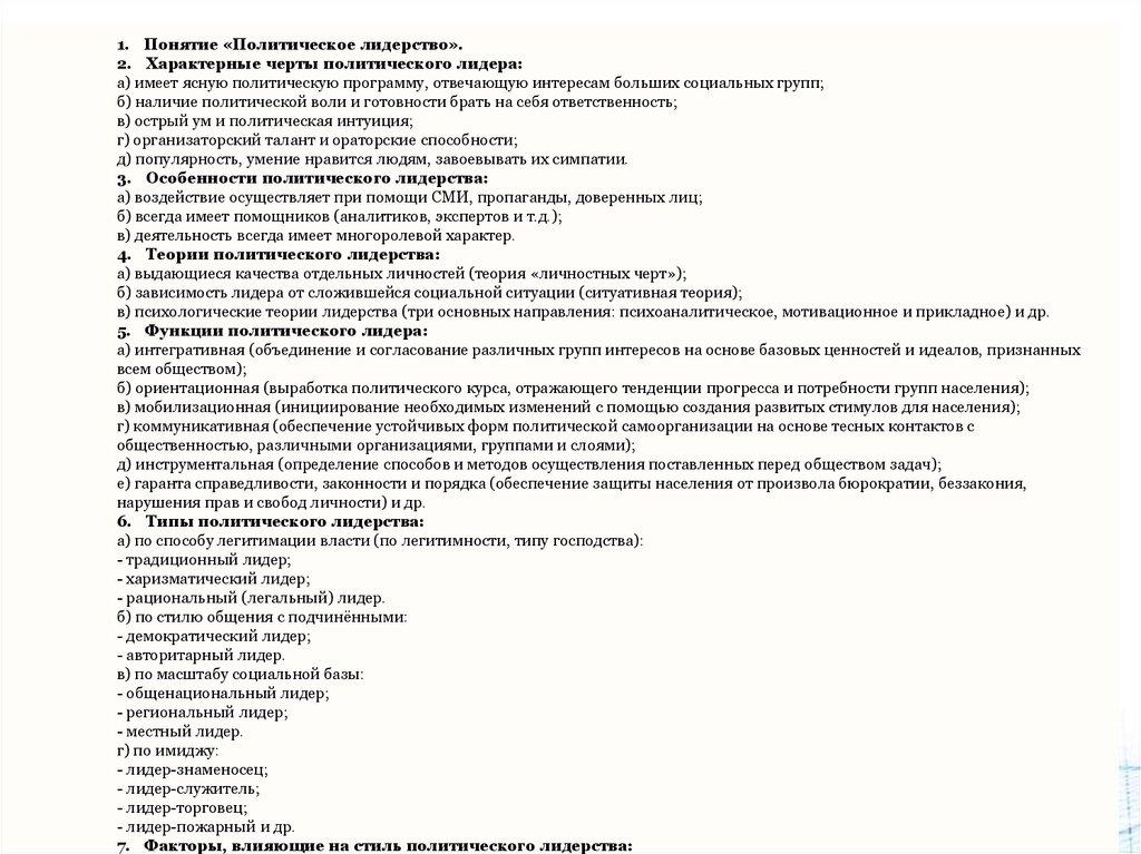 1. Понятие «Политическое лидерство».2. Характерные черты политического лидера: