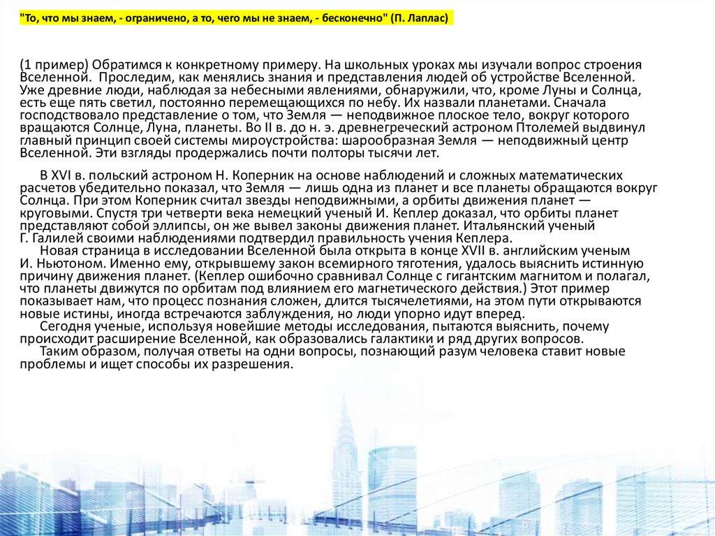 "То, что мы знаем, - ограничено, а то, чего мы не знаем, - бесконечно" (П. Лаплас)(1 пример) Обратимся к конкретному примеру. На школьных уроках мы изучали вопрос строения