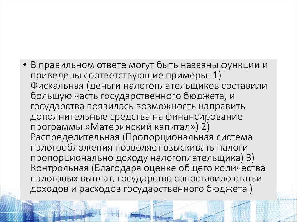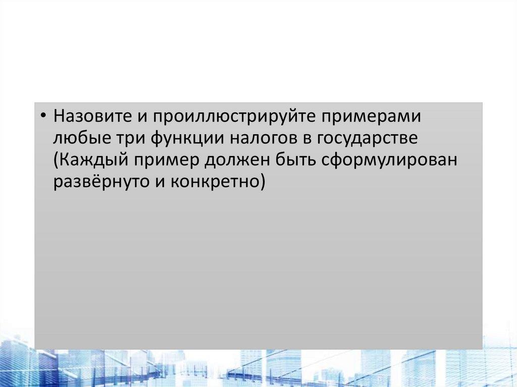 • Назовите и проиллюстрируйте примерамилюбые три функции налогов в государстве