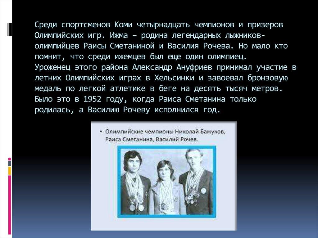 Среди спортсменов Коми четырнадцать чемпионов и призеровОлимпийских игр. Ижма – родина легендарных лыжниковолимпийцев Раисы Сметаниной и Василия Рочева. Но мало кто