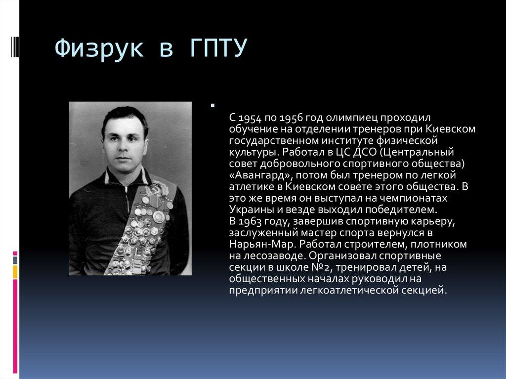 Физрук в ГПТУС 1954 по 1956 год олимпиец проходил