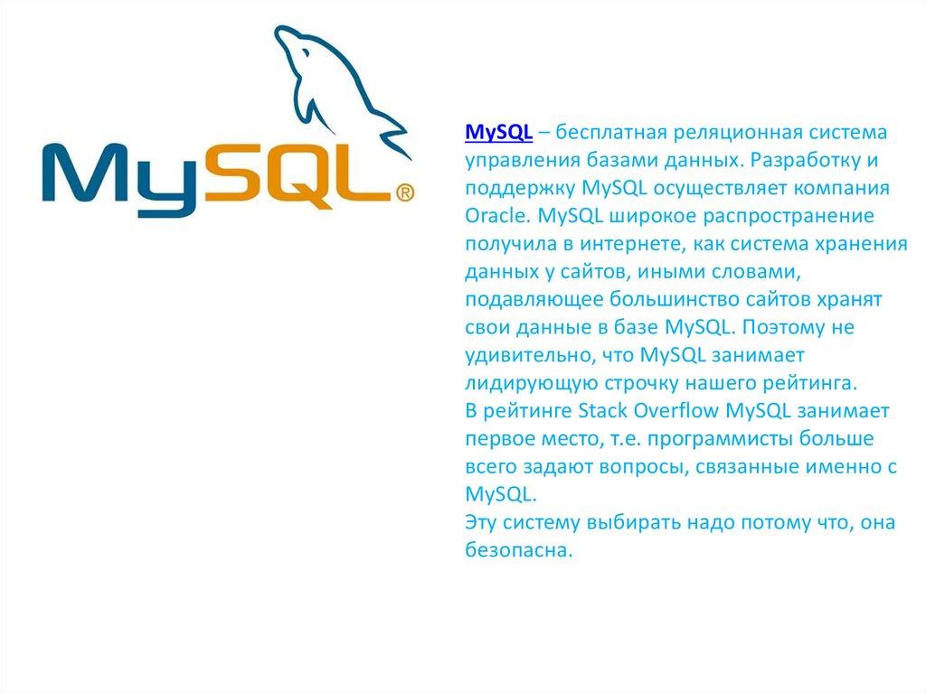 MySQL – бесплатная реляционная системауправления базами данных. Разработку и