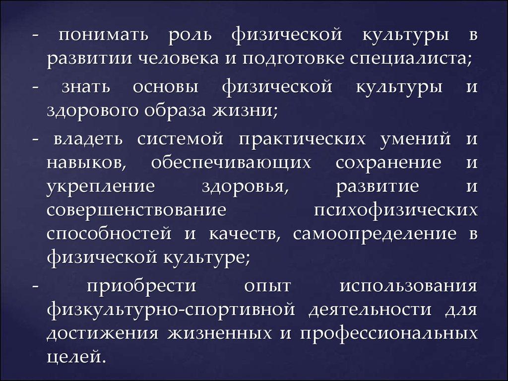 - понимать роль физической культуры вразвитии человека и подготовке специалиста;