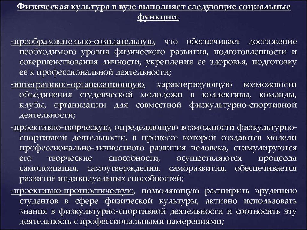 Физическая культура в вузе выполняет следующие социальныефункции: