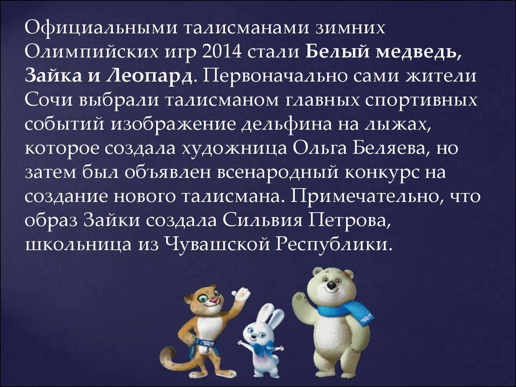 Официальными талисманами зимнихОлимпийских игр 2014 стали Белый медведь,