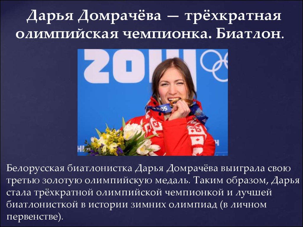 Дарья Домрачёва — трёхкратнаяолимпийская чемпионка. Биатлон.