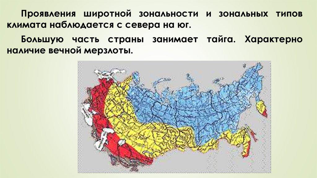 Проявления широтной зональности и зональных типовклимата наблюдается с севера на юг.