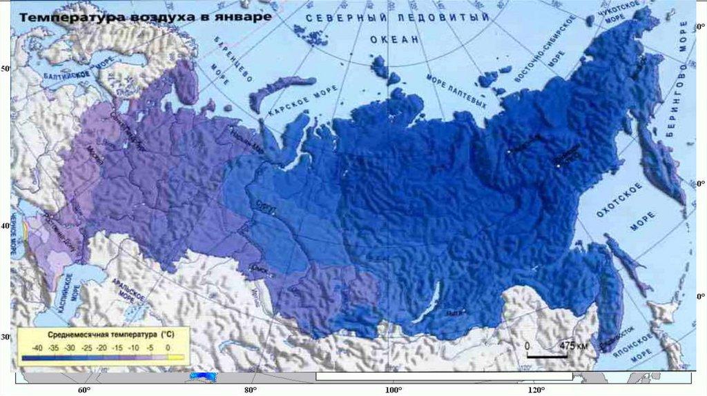 Температуры январяНа ход январских изотерм оказывает решающее воздействие