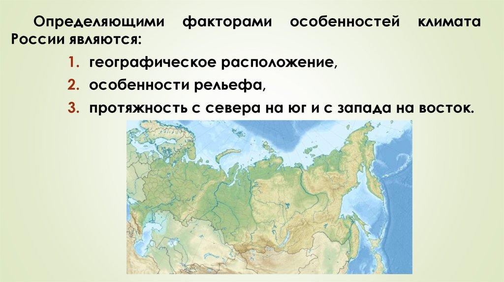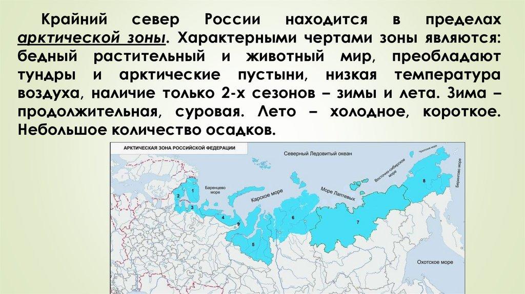 Россия находится в пределах 2-х основных и 2-хпереходных климатических зон: арктической и умеренной,