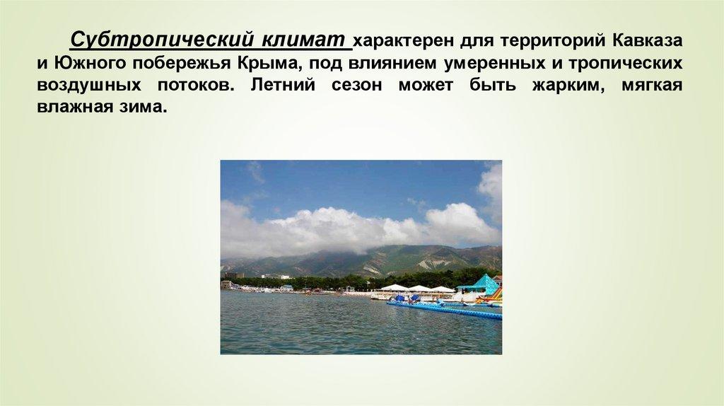 Субтропический климат характерен для территорий Кавказаи Южного побережья Крыма, под влиянием умеренных и тропических
