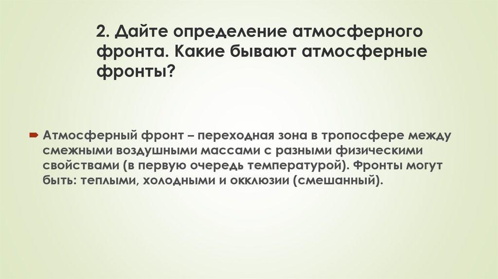 2. Дайте определение атмосферногофронта. Какие бывают атмосферные