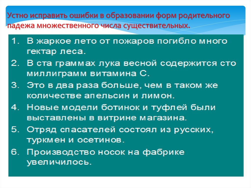 Устно исправить ошибки в образовании форм родительногопадежа множественного числа существительных.