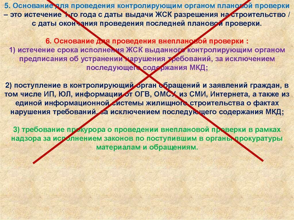 5. Основание для проведения контролирующим органом плановой проверки– это истечение 1-го года с даты выдачи ЖСК разрешения на строительство /