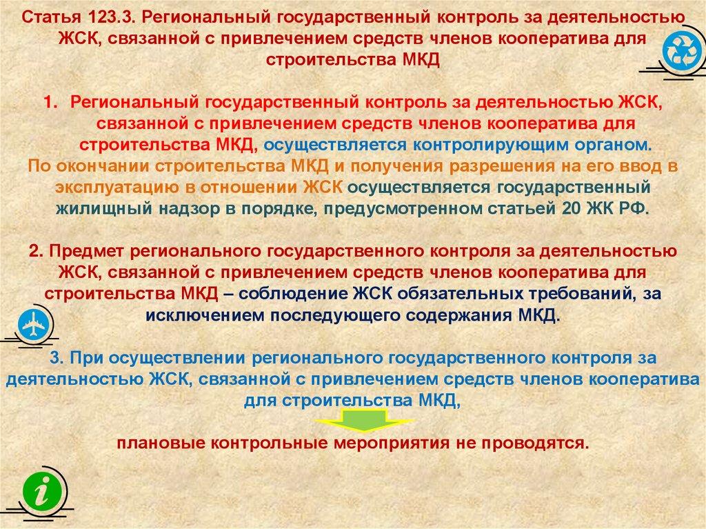 Статья 123.3. Региональный государственный контроль за деятельностьюЖСК, связанной с привлечением средств членов кооператива для