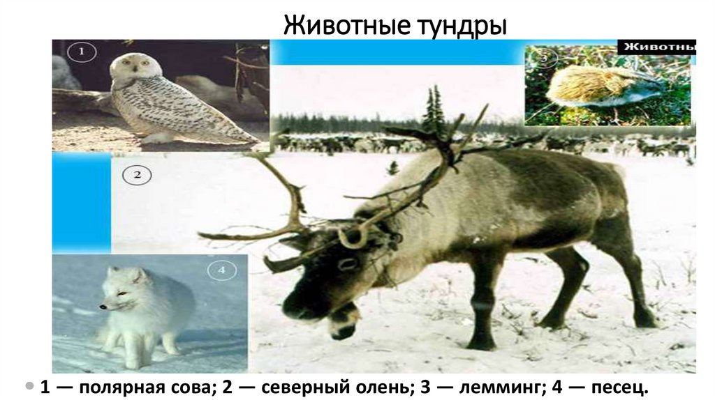 Животные тундры1 — полярная сова; 2 — северный олень; 3 — лемминг; 4 — песец.