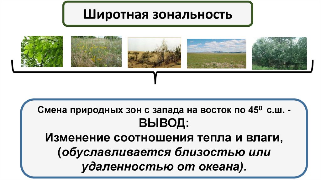 Широтная зональностьСмена природных зон с запада на восток по 450 с.ш. -