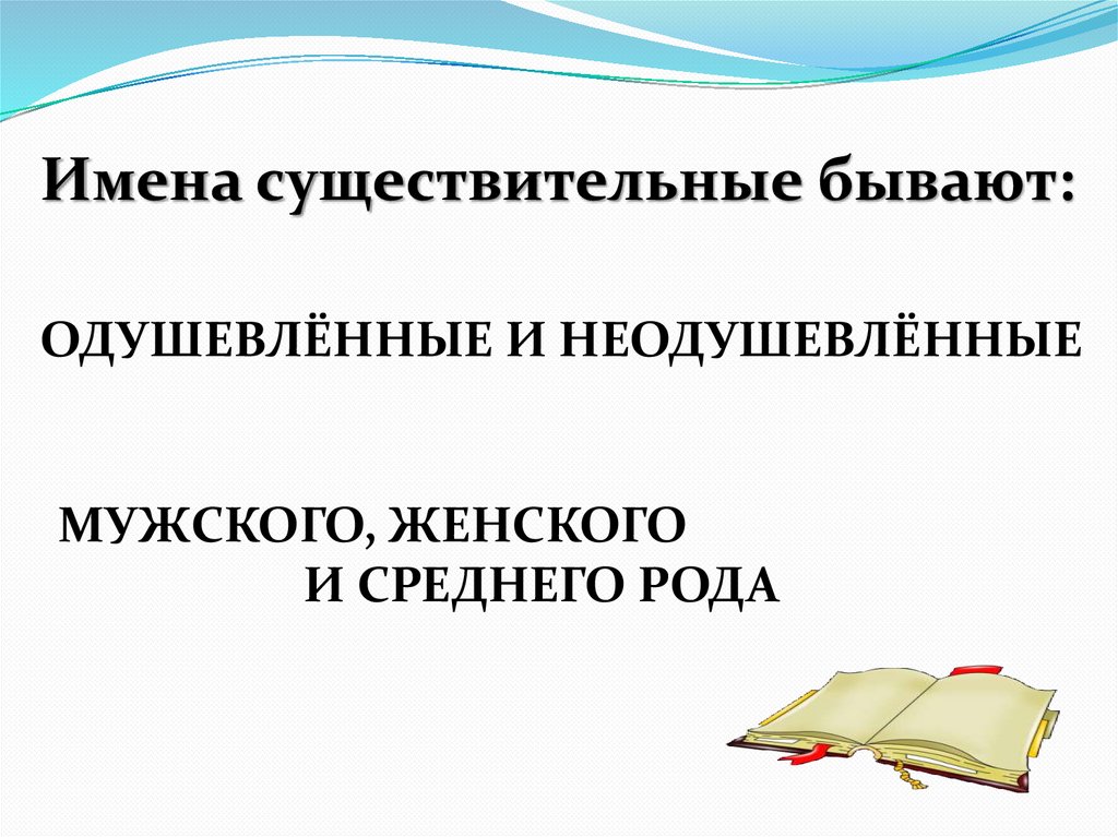 Имена существительные бывают:ОДУШЕВЛЁННЫЕ И НЕОДУШЕВЛЁННЫЕ
